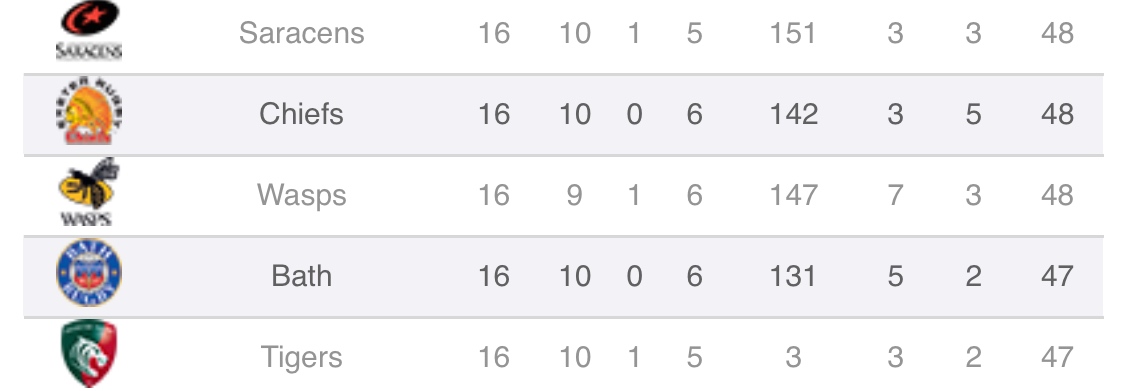 Well, funny you should mention that. Because, you see, between 2nd in the league (Saracens) and 6th (Tigers) there is one point. The battle for an invaluable top four berth is so tight it could well come down to points difference. As we head in to round 17 (6 games left) here is how 2nd to 6th looks on the table.