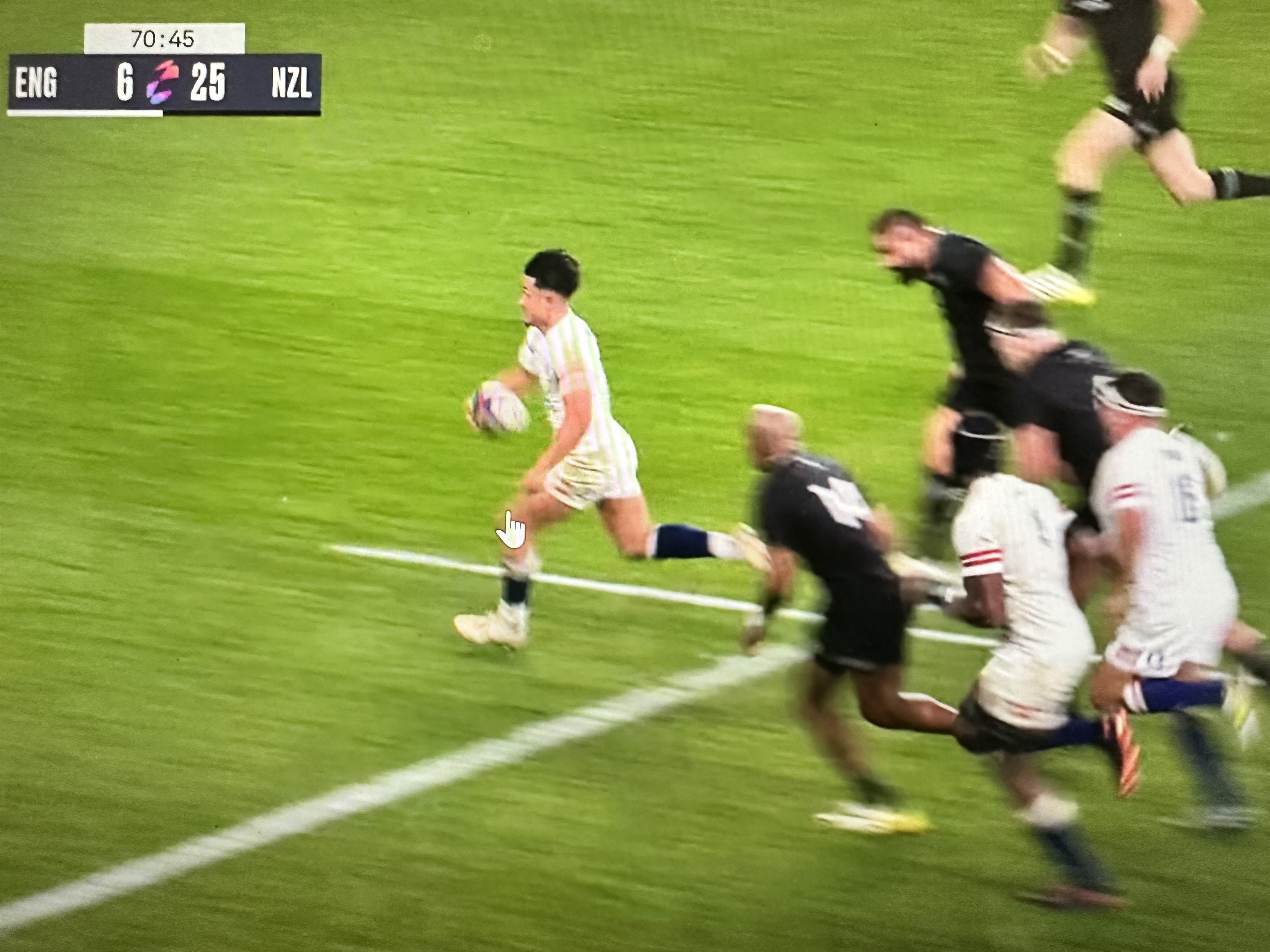 But back to Smith. England’s replacements had added zest to a flagging performance and a tip-on from Will Stuart had landed in young Marcus’ grasp. He was facing in completely the wrong direction but flung a dummy, pirouetted on his heel and fell into the oncoming clutches of Mark Telea and Richie Mo’unga. In the ensuing tussle, the Harlequin spilt the ball and showed his displeasure by landing a clenched fist against the turf of England’s home ground. He pleads with referee Raynal and Andrew Cotter in commentary compares England’s attack to that of the sea hitting rocks; seemingly powerful but apparently fruitless in their approach.